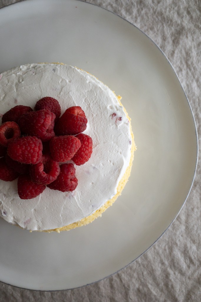 For the whipped cream topping place heavy whipping cream in a stand mixer and beat on medium/high speed for about 1min. Add raspberries, honey(or sugar) and vanilla, continue beating until fluffy and medium peaks form. Place on top of cake and top with fresh raspberries.