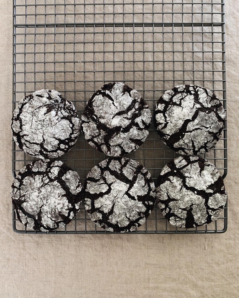 Combine the confectioners’ sugar and the remaining 3 tbs.(45g) granulated sugar in a small bowl. Scoop the dough into 45g or 2 tbs. sized balls. Roll the dough in the sugar mixture. Place 6-7 cookies on each sheet pan. Bake one pan at a time, rotating half way through baking. Bake until the edges are set and the cookies are puffed but still soft in the middle, 8-9min for very soft cookies, and 9-10min for a cookie with firm edges and soft center. Transfer to sheet pans to a wire rack and let the cookies cool to room temp. Cookies can be stores in an airtight container at room temp. for up to 3 days.